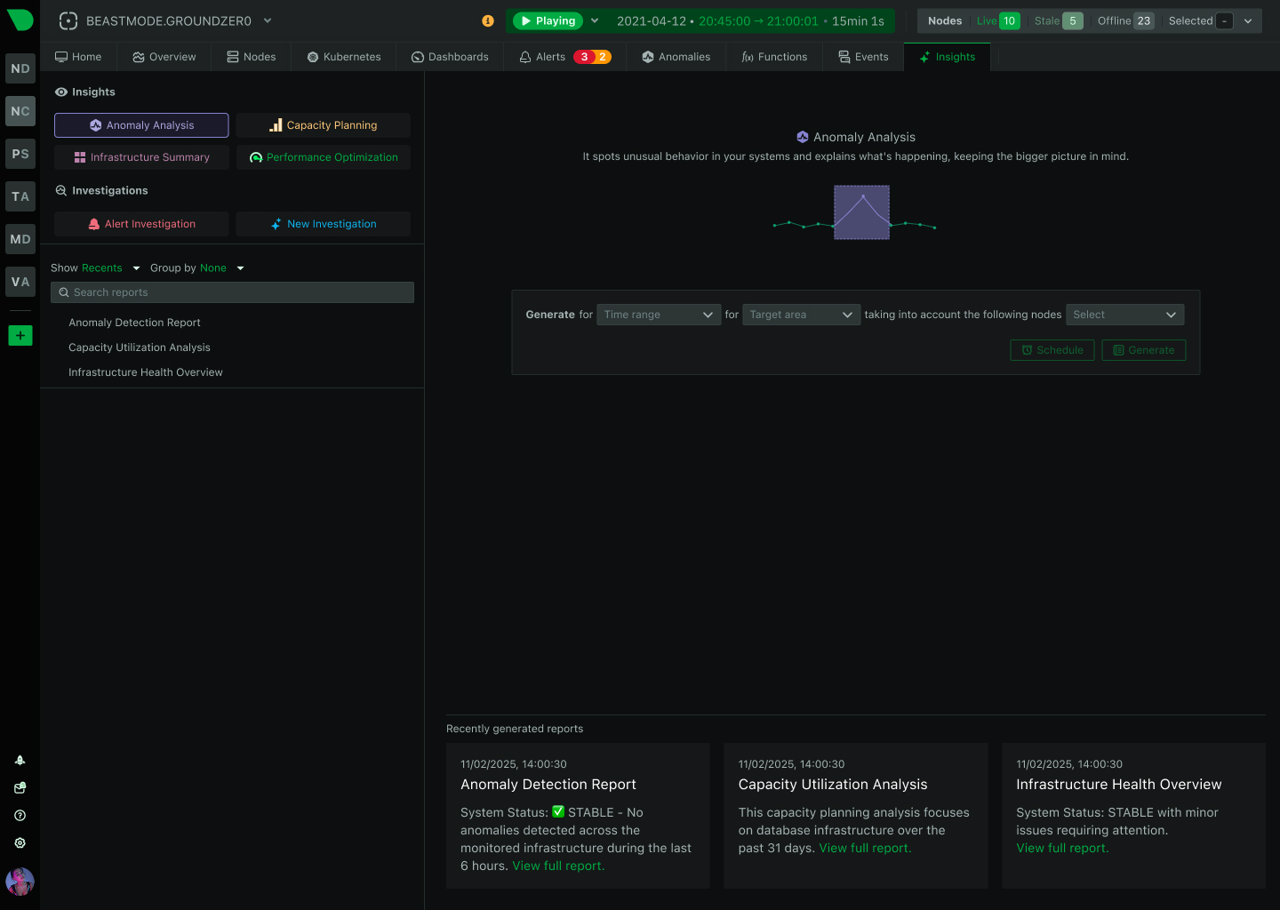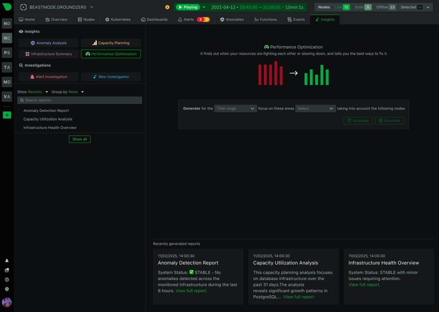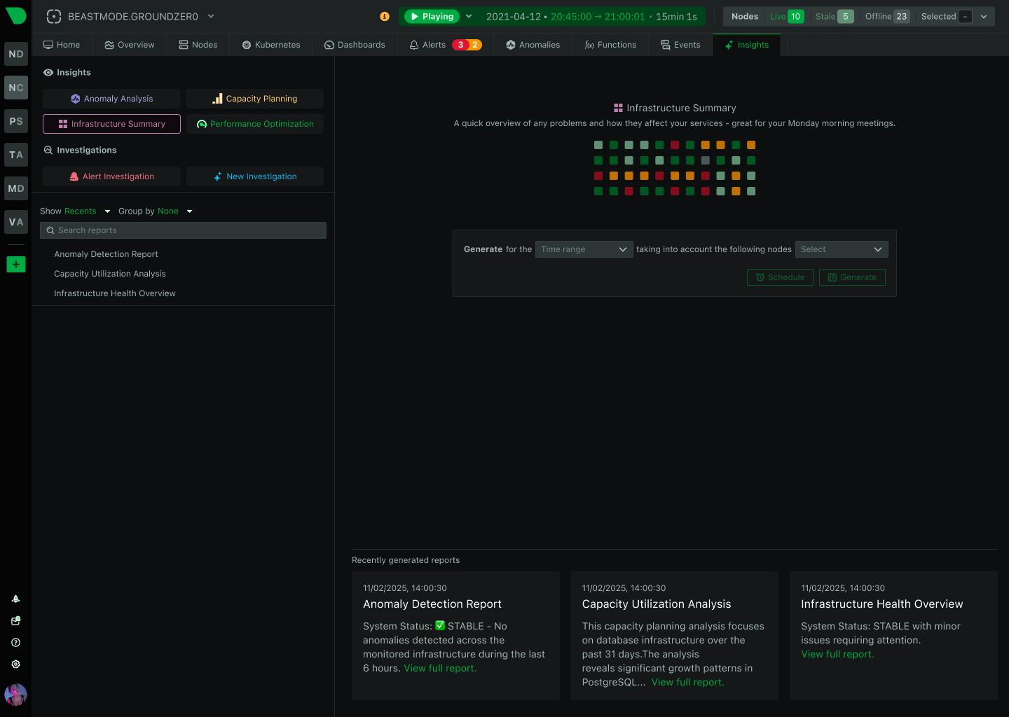 Transform overwhelming observability data into actionable intelligence. Netdata’s AI reporting delivers automated infrastructure summaries, capacity forecasts, performance optimization recommendations, and root cause analysis - all generated in 2-3 minutes with zero configuration.